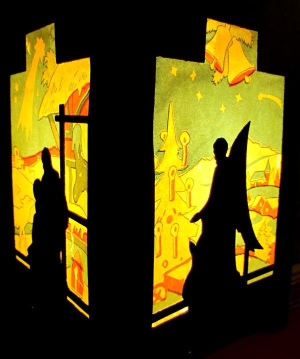 Weihnachts-LAMPENSCHIRMLampenschirm mit 6 Segmenten aus gestanztem und geprägtem Karton von 1890, mit farbigem Transparent-Papier hinterlegt.